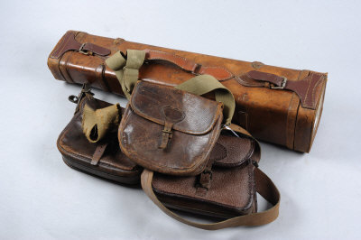 A LEATHER DOUBLE MOTOR CASE with compartments for 30-inch barrels; together with three leather cartridge bags (4) |
