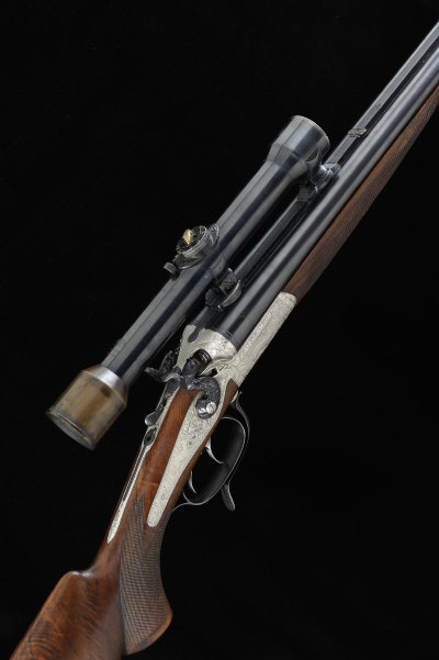A GERMAN 16-BORE/5.6X50R HAMMER DRILLING, NO. 11835 25-inch replacement Ferlach barrels with 2 3/4-inch chambers, about 1/2 and 3/4 choke borings, doll's head extension, mounted with a Zeiss Zielvier telescopic sight on quick detachable claw mounts, the rounded frame, rebounding back locks, hammers and push-forward underlever profusely engraved with oak leaves surrounding woodland scenes of deer, dogs and ducks, set front trigger, tang with folding peep sight, 13 1/2-inch figured stock with pistol grip and cheekpiece, butt plate with trap, 7lb. 10oz., Austrian nitro proof S1 |