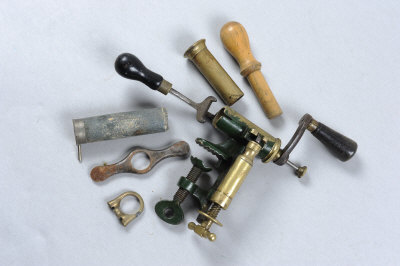 comprising: a scarce 12-bore combined rolled turnover and capper/de-capper tool; wad pusher and funnel; case sizer, etc, together with a pinfire 4-bore paper case