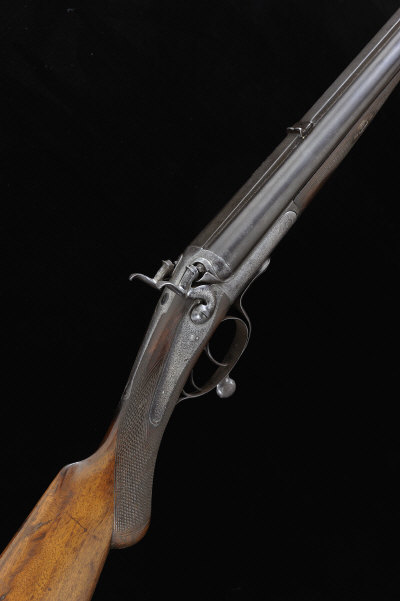 R. B. RODDA & CO. A .500 "NO.2 EXPRESS" HAMMER HOWDAH RIFLE, NO. 22637 19-inch barrels with Henry patent rifling, rear sight with folding leaf and broad file-cut rib, the rounded frame, hammers, rebounding backlocks and rotary underlever with scroll engraving, 14 1/2-inch replacement stock with pistol grip, chequered steel butt plate, 8lb. 8oz., black powder proof, worn overall S58 |