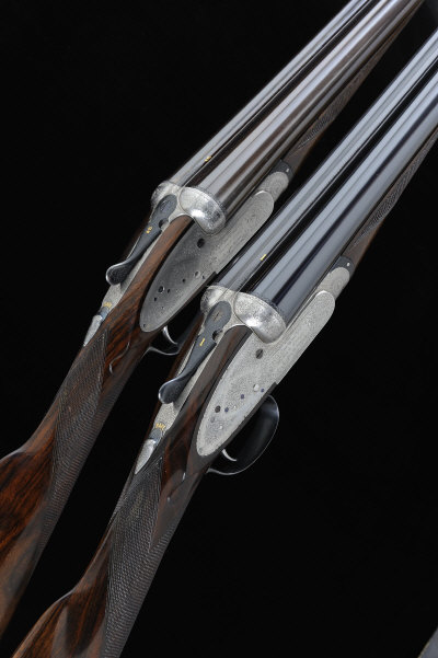 HENRY ATKIN A PAIR OF 12-BORE SINGLE TRIGGER SIDELOCK EJECTOR GUNS, NOS. 1841/2 28-inch barrels, No.1 gun with 2 1/2-inch chambers about true cylinder and 1/4 choke borings, No.2 gun with replacement chopper-lump barrels with 2 3/4-inch chambers about 1/4 and 1/2 choke borings, the frames, locks and gold numbered top levers with fine scroll engraving, single triggers, 14 1/4-inch well figured stocks including leather covered recoil pads, 6lb. 10oz., nitro re-proof, in their brassbound oak and leather case S2 The No.2 gun was re-barrelled in 1999. |