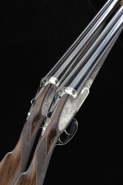 HENRY ATKIN A MATCHED PAIR OF 12-BORE SIDELOCK EJECTOR GUNS, NOS. 2811/2816 28-inch barrels with 2 3/4-inch chambers about improved cylinder and 1/2 choke borings, the frames, locks and numbered top levers with border engraving and retaining much original hardening colour, the maker's name signed within a scrolling banner, 15-inch figured stocks including leather covered recoil pads, 6lb. 11oz., nitro re-proof, brassbound oak and leather case |