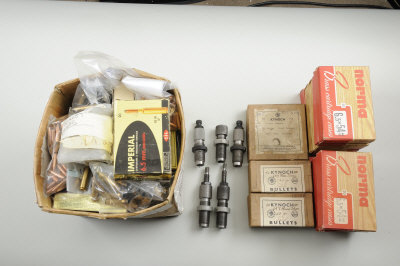 A QUANTITY OF RELOADING ACCESSORIES for 6.5 Mannlicher Schoenauer, comprising: reloading press, dies, a large quantity of cartridge cases and bullets |