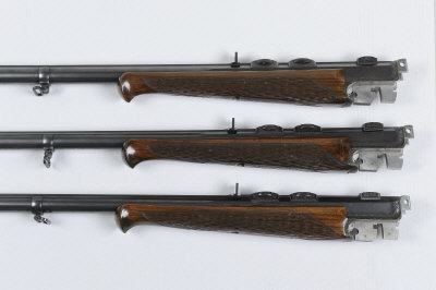 WALTER GEHMANN THREE KIPLAUF RIFLE BARRELS, NOS. 204177, 205177 AND 207177 the interchangeable 28-inch barrels in the calibres .458 Win Mag, .340 Weatherby Mag and 7mm Rem Mag respectively, each with machined top surfaces and ramp fore sights, fixed rear sight and bases for quick detachable claw mounts, Kersten bolt extensions and individual fore-ends, Austrian nitro proof (3) S1 |