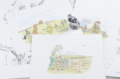 LE JEUNE A CHROME PLATED BRASS MASCOT OF A GROUSE together with a small collection of original artwork commissioned for The Shooting Times by Chris Moller; and prints of sporting interest, etc |