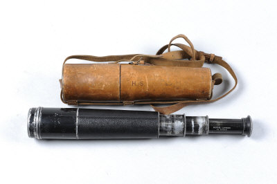 ROSS, LONDON A LIGHTWEIGHT THREE-DRAWER STALKING TELESCOPE, NO. 55966 the alloy body with black leather grip, sliding sunshade, the eyepiece engraved "Herbert Samuelson", in its leather tube with strap |
