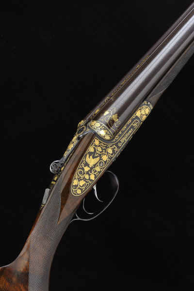 GILES WHITTOME A SUPERB AND UNIQUE 12-BORE "THE PARAGON PINLESS" ROUND BODY SINGLE/DOUBLE TRIGGER SELF-OPENING SIDELOCK EJECTOR GUN, NO. 1005 28-inch damascus barrels with 2 3/4-inch chambers, about improved cylinder borings, top extension, gold fore sight bead in the form of a Labrador's head inset with diamond eyes, vine leaf gold inlaid breeches, the rib inlaid in gold "Giles Whittome, London", the rounded frame, pinless hand detachable locks and pierced top lever profusely engraved and inlaid in gold with fruiting vines surrounding scenes of game birds in flight, all set against a matted black ground, rolled edge trigger guard with further gold inlaid decoration, double triggers with the front trigger operating as a single trigger, the trigger plate signed "P. Sabatti, G. Berttella", 16-inch well figured stock with Prince of Wales grip, grip cap and skeleton butt plate with further decoration, 7lb. 8oz., nitro proof, in its maker's rosewood presentation case with brass stringing and ebony sealing strips, contained in its velvet lined canvas outer cover, complete with tools and accessories S2 The gun was completed in 1982 as a presentation piece. It was engraved by the Italian master, Sabatti and finished to the very highest possible standard. The damascus barrels were sourced from original unfinished tubes from the workshop of Thomas Bland and it was actioned by Brian Gibbs, formerly of Holland & Holland. |