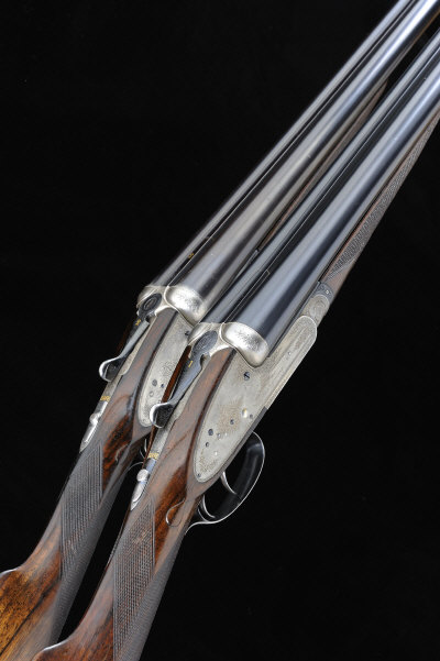 HOLLAND & HOLLAND A MATCHED PAIR OF 12-BORE "BADMINTON" MODEL SIDELOCK EJECTOR GUNS, NOS. 24937/26856 30-inch barrels with 2 1/2-inch chambers about 1/4 and 1/2 and improved cylinder and 1/2 choke borings respectively, No.1 gun barrels sleeved by Westley Richards, the frames, locks and gold numbered top levers with fine scroll engraving and retaining some original hardening colour, gold lined cocking indicators, 15 1/4-inch well figured stocks, built for the right shoulder but now with slight cast-on for the left shoulder, 7lb. and 6lb. 8oz. respectively, nitro proof