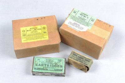 A GROUP OF COLLECTORS AMMUNITION comprising: 100 rnds Kynoch 10.75mm Mauser ammunition, metal covered soft-nosed bullet, 347 grns; together with 50 rnds Kynoch .475 No.2, metal covered solid bullet, 480 grns; and a tin of 50 Eley Bros. .450 cartridges