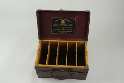 CHARLES HELLIS & SON A BRASSBOUND OAK AND LEATHER CARTRIDGE MAGAZINE for about 500 cases, with oak dividers |