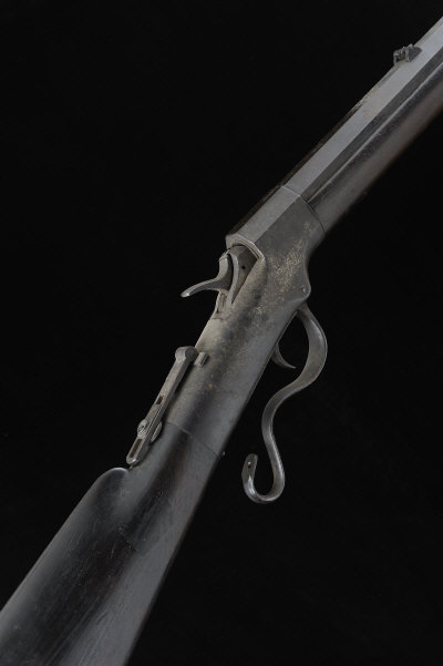 30-inch octagonal barrel, fore sight missing, rear sight broken, the rounded frame with underlever and central hammer with folding aperture rear sight, 13 1/2-inch stock with steel crescent butt plate, 10lb., worn overall
