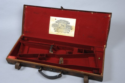 W. R. PAPE A BRASSBOUND LEATHER DOUBLE GUN CASE with compartments blocked for 27 1/2-inch barrels (will take 30-inch) |