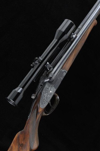 24 1/2-inch barrels with 2 3/4-inch chambers, about 3/4 and full choke borings, machined rib with folding leaf sight and mounted with a Zeiss Zlelsechs telescopic sight on quick detachable claw mounts, the lightweight alloy receiver, detachable locks and top lever with fine scroll engraving around highly detailed scenes of deer against woodland backgrounds and retaining much of its original blacked bright finish, side barrel selector, lined cocking indicators, horn trigger guard and set front trigger, 13 3/4-inch well figured stock with pistol grip and engraved steel butt plate with trap, sling swivels, 7lb. 6oz., German nitro proof