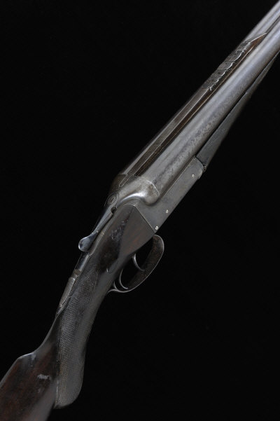 28-inch barrels with 2 1/2-inch chambers, short raised rib with folding leaf sights and cross-bolt extension, the frame and top lever with traces of scroll engraving, 14 1/2-inch stock with pistol grip, 7lb. 12oz., nitro proof, worn and re-finished overall