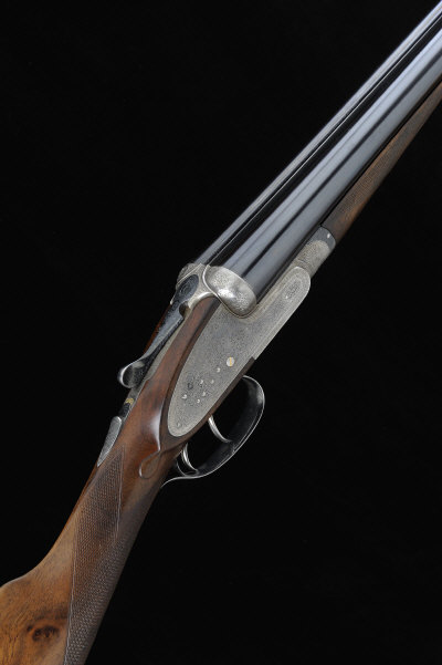 JOSEPH LANG & SON A 12-BORE SIDELOCK EJECTOR GUN, NO. 16304 28-inch chopper-lump barrels with 2 1/2-inch chambers, about true cylinder and 1/2 choke borings, the frame, locks and top lever with bouquet and scroll engraving and retaining some original hardening colour, gold lined cocking indicators, 15 1/2-inch well figured replacement stock, 6lb. 10oz., nitro proof, in its maker's brassbound leather case S2 |