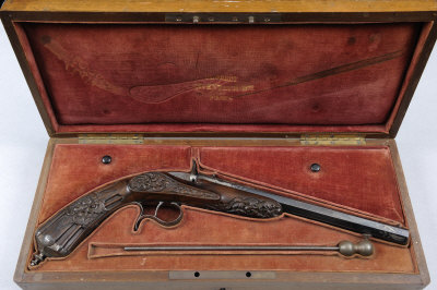 FLOBERT A FRENCH .22 FLOBERT GALLERY PISTOL 9 1/4-inch octagonal barrel with fixed sights, engraved and inlaid breech and muzzle, the top surface signed in silver, "Flobert Inventeur Bte à Paris", fixed sights, the carved walnut grip with engraved cap and steel furniture, in its maker's velvet-lined walnut case S5 This lot will not be available for viewing in London. It can be viewed by appointment at our office in West Sussex. |