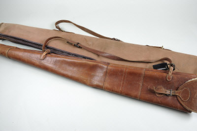 A LEATHER DOUBLE GUN SLIP suitable for a pair of guns, with fleece linings; together with a canvas double gun slip, suitable for a pair of guns, with fleece linings (2) |