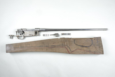 A .375 MAGNUM BARRELLED ACTION, NO. 6127 complete with the major components and partially inlet-ed to complete a Mauser 98 sporting rifle, 26-inch barrel stamped W. J. Jeffrey & Co. underneath and proofed in 2004, receiver with standard length bolt, complete with magazine box with hinged floor plate, fore and rear sights, butt trap, together with a partially inlet-ed rifle stock blank for this rifle (2) S1 |