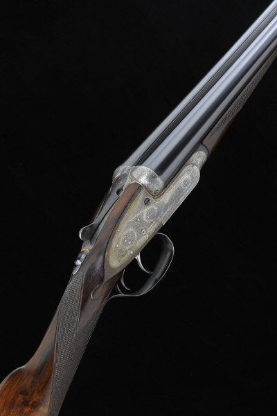 J. PURDEY & SONS A 12-BORE SELF-OPENING SIDELOCK EJECTOR GUN, NO. 16433 27-inch shortened chopper-lump Whitworth steel barrels with 2 1/2-inch chambers, about true cylinder borings, the frame, locks and top lever with fine bouquet and scroll engraving, 14-inch well figured stock including rubber recoil pad, 6lb. 4oz., nitro proof, in its maker's oak and leather case S2
