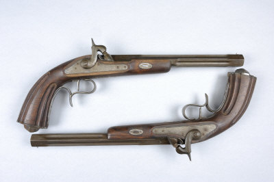 A COMPOSED PAIR OF MODERN .44 PERCUSSION TARGET PISTOLS, NOS. 16311/16613 10-inch hexagonal fluted barrels engraved at the muzzles, adjustable rear sights, the locks and hammers with scroll engraving, half length walnut stocks with fluted grips and steel furniture, black powder proof S1 This lot will not be available for viewing in London. It can be viewed by appointment at our office in West Sussex. |