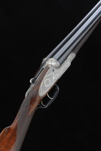 JOSEPH LANG & SON A 12-BORE SIDELOCK EJECTOR GUN, NO. 8113 28-inch replacement barrels by the maker, with 2 1/2-inch chambers, about 1/4 and 1/2 choke borings, doll's head extension, the frame, locks and top lever with fine bouquet and scroll engraving, the maker's name signed within a scrolling banner, 14 1/2-inch well figured replacement stock, 6lb. 11oz., nitro proof S2 |