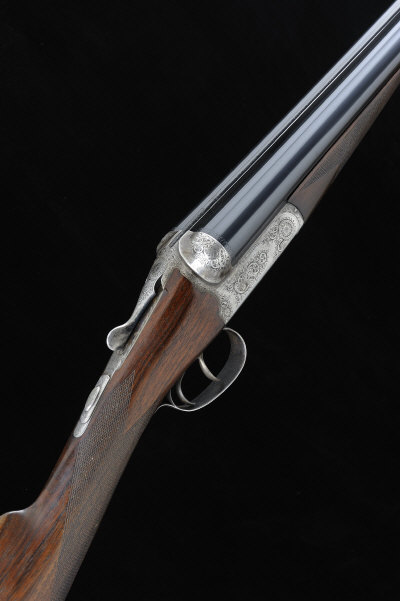 W. W. GREENER A 12-BORE BOXLOCK EJECTOR GUN, NO. 69772 28-inch barrels with 2 3/4-inch chambers, about 1/4 and 1/2 choke borings, crossbolt extension, the frame and top lever with scroll engraving and retaining traces of original hardening colour, rolled edge trigger guard, 14 1/2-inch well figured stock with ribbed butt plate, cast-on for the left shoulder, 6lb. 14oz., nitro proof, left bore dented S2 |