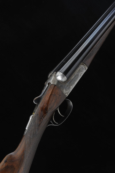 HOWARD DAVIES A 12-BORE BOXLOCK EJECTOR GUN, NO. 5209 28-inch barrels with 2 1/2-inch chambers, about 1/4 and 3/4 choke borings, top extension, the frame and numbered top lever with scroll engraving and retaining some original hardening colour, the maker's name signed within a scrolling banner, 14-inch figured stock, 6lb. 5oz., nitro proof, re-jointing recommended, right bore marked S2 |