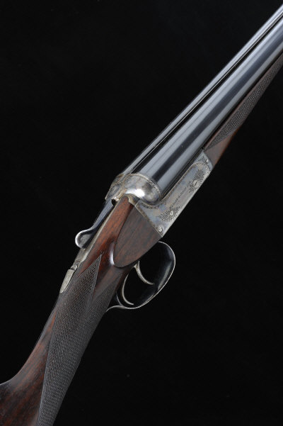 28-inch barrels with 2 1/2-inch chambers, about 1/2 and full choke borings, top extension, the frame and top lever with border and scroll engraving and retaining much original hardening colour, 15-inch well figured stock including rubber recoil pad, 6lb. 11oz., nitro proof, fore-end wood chipped