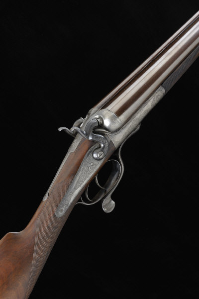 W. H. MONK AN 8-BORE HAMMER GUN, NO VISIBLE NUMBER 36 1/4-inch damascus barrels with 3 1/4-inch chambers, about full choke borings, the rounded frame, rebounding back locks, hammers and rotary underlever with fine scroll engraving and retaining traces of original hardening colour, 14 1/4-inch figured stock with steel butt plate, 11lb. 12oz., black powder proof (1868 Rules) S58 This lot is sold as a Section 58 antique and will require re-proof if it is intended to be used. |