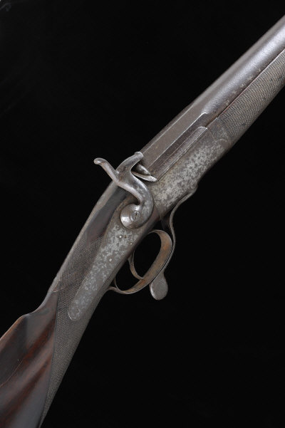 48 1/4-inch damacus barrel with 4-inch chamber, about true cylinder boring, the rounded frame, non-rebounding back lock, hammer and rotary underlever retaining traces of original finish, the 14 1/4-inch stock with steel butt plate, 19lb. 10oz., black powder proof, rusted overall to a brown patina