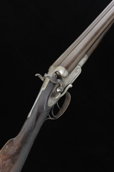 29 3/4-inch damascus barrels with 2 1/2-inch chambers, about improved cylinder borings, machined flat rib, the plain frame, bar locks, hammers and side lever with border engraving, 14 1/4-inch figured stock with steel butt plate, 6lb. 5oz., nitro re-proof