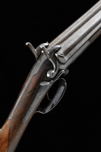W. W. FORSYTH A 12-BORE SIDE LEVER PINFIRE GUN, NO. 2260 25 1/2-inch shortened damascus barrels with 2 1/2-inch chambers, the rounded frame, non-rebounding back locks, hammers and side lever with scroll engraving and retaining traces of original hardening colour, 13 3/4-inch figured stock with steel butt plate, 6lb. 9oz., black powder proof, bores pitted and dented |