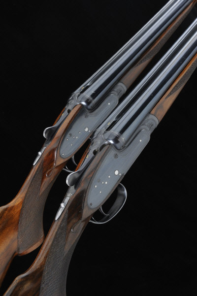 ARRIETA A PAIR OF 20-BORE SINGLE TRIGGER SELF-OPENING SIDELOCK EJECTOR GUNS, NOS. 34959/60 26-inch chopper-lump barrels with 2 3/4-inch chambers, about improved cylinder and 3/8 choke borings, Churchill ribs, the frames, locks and gold numbered top levers with border engraving and retaining most of their original blued finish, Holland & Holland self-opening mechanism, 14-inch well figured stocks with pistol grips, 5lb. 14oz., Spanish nitro proof S2 |