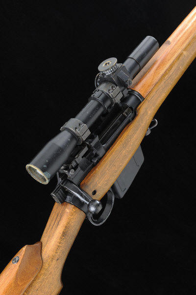 ENFIELD A 7.62MM NO.4 MARK 1/2 BOLT-ACTION RIFLE, NO. A45715, OF L42 TYPE 25 1/4-inch replacement heavy barrel, the receiver mounted with a L1A1 telescopic sight in its apparently correct mount, the butt socket with broad arrow stamp and dated 1954, detachable box magazine, the half length beech stock with cheekpiece and brass butt plate, 13-inch pull, 13lb. 4oz., nitro proof S1 |