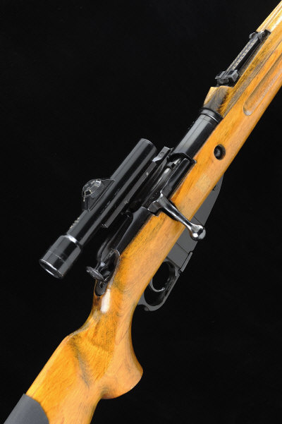 28-inch barrel with raised fore sight and tangent rear sight, the receiver fitted with its telescopic sight, the mount numbered H4713, the half length stock with pistol grip and steel butt plate, 13 1/4-inch pull, 9lb. 13oz., nitro proof