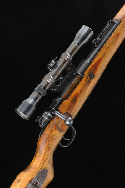 MAUSER A 7.92MM K98K BOLT-ACTION SNIPER RIFLE, NO. 50627G 24-inch barrel the BYF marked receiver with '43 date stamp, the short side mount mounted with a Hensoldt-Wetzlar telescopic sight, bolt with flag safety, three quarter length laminated stock with pistol grip and steel butt plate, 13-inch pull, 11lb., nitro proof, possibly composed, the stock with applied fake Luftwaffe decal S1 |