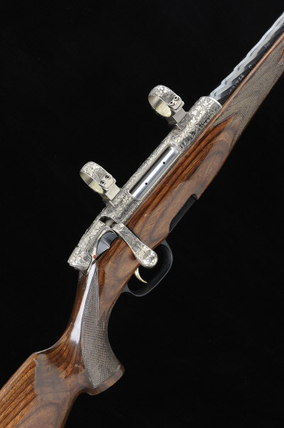 23-inch barrel threaded for a sound moderator, the receiver profusely engraved with boldly carved acorns and oak leaves, with detailed scene of fighting stags within a woodland setting, matching scope rings, bolt with side safety, detachable box magazine, the half length laminated stock with pistol grip, cheekpiece and rubber recoil pad, sling swivels, 14-inch pull, 8lb. 4oz., Austrian nitro proof
