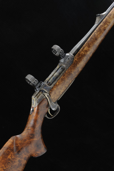 24-inch barrel with ramp fore sight and raised rear sight, the receiver profusely engraved overall with fine scroll engraving surrounding bold foliate scrollwork and a highly detailed big game scene of a leopard chasing antelope within a gold lined border, the bolt with a leopard mask, the magazine base plate with a kudu and trigger guard with a warthog, matching quick detachable scope rings, retaining all of its original hardening colour, the half length burr walnut stock with pistol grip, cheekpiece and rubber recoil pad, the cheekpiece inlaid with the outline of the African continent, 14 1/4-inch pull, sling swivels, 8lb. 12oz., German nitro proof