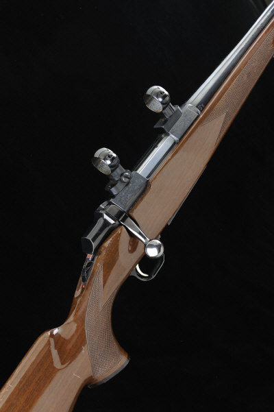 22-inch barrel, the receiver mounted with scope rings, bolt with tang safety, magazine with hinged base plate, the half length stock with pistol grip and rubber recoil pad, 13 3/4-inch pull, 7lb. 2oz., nitro proof