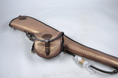 AN OSTRICH LEATHER GUN SLIP with fleece lining; together with a matching cartridge bag, for about 100 cases, both in a golden finish (2) |