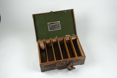 J. GRAHAM & CO. A BRASSBOUND LEATHER CARTRIDGE MAGAZINE for about 300 cases, with leather straps and oak dividers |
